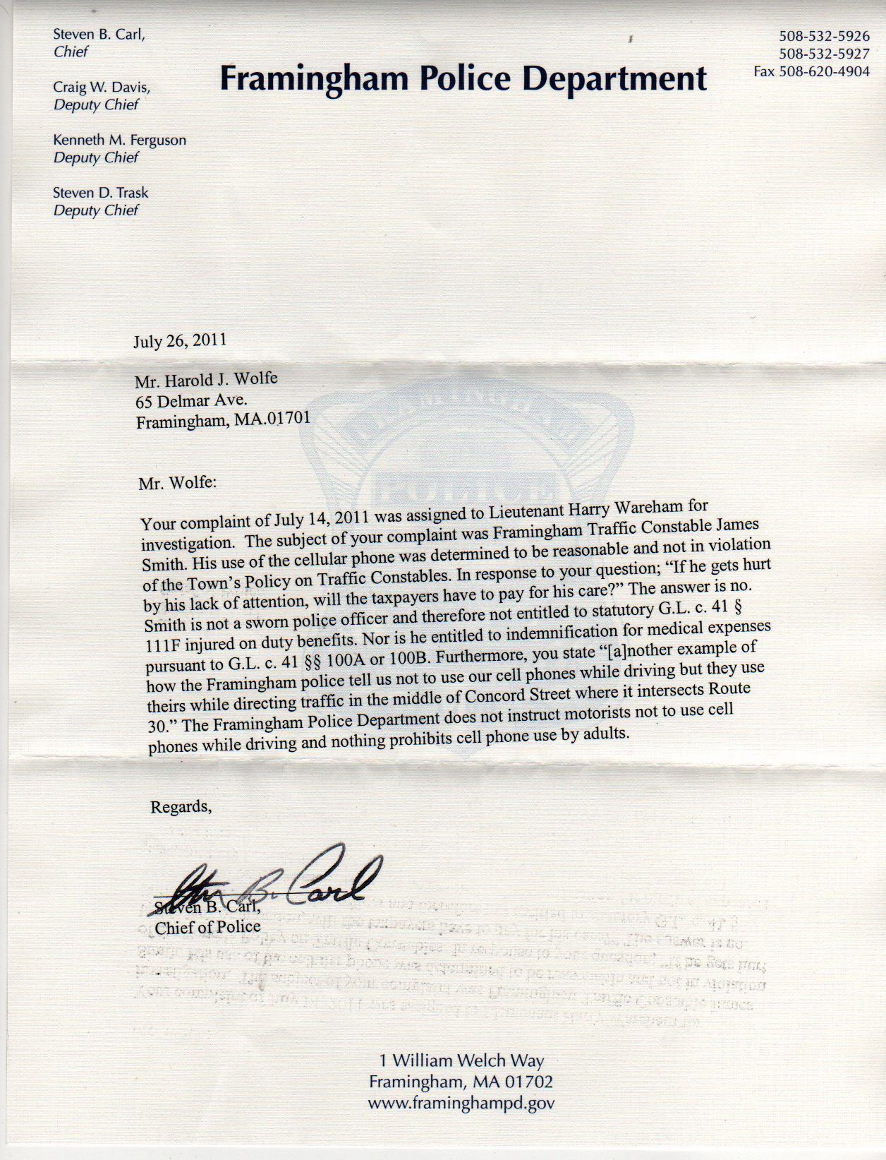 The police chief simply makes a declarative statement that cellphone usage by the police while directing traffic is permissible at any time. Notice that the police chief states that James Smith is a Traffic Constable. That explains the necessity of a large gun and a deadly accident waiting to happen when he trips and misfires his gun. I suppose the school crossing guards wear guns? I never saw fire department personnel working traffic detail wearing guns. |