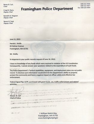 Request sent to: sbc@framinghamma.gov town.manager@framinghamma.gov selectmen@framinghamma.gov Given that the police department has received over $850,000 in unconstitutional civil forfeitures, I have several questions about how those monies are handled. 1. Are those monies placed in the town's General Fund? 2. If so, are these monies then allocated back to the police department? 3. Can I get a comprehensive list of what was purchased with these funds? Another set of questions I have concern themselves on how well armed the Framingham police are. This is related to the ongoing paramilitarization of the Framingham police (two SWAT related vehicles to date). I suspect that the Framingham are arming themselves way in excess of its need as a police force and it's now beginning to look like a military force with its khaki uniforms. I was reminded of this by this photo album http://imgur.com/a/Asgdb#0 1. How many high capacity automatic, semi-automtic and automatic weapons does the Framingham police department have? 2. How many of these weapons are carried around in cruisers? 3. How much ammunition does the Framingham police buy on an annual basis? 4. Are any weapons or ammunition mentioned in these weapons purchased with civil forfeiture funds? Last but not least, a few of questions on license plate scanners. 1. What is the make and model number of any license plate scanner owned by the Framingham police? 2. Were civil forfeiture funds used in their purchase? 3. Have they been of any use to your staff? If so, how? |